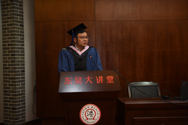 随后,学生代表2015届在职法律硕士毕业生缪晓军同学进行发言,缪同学感谢付出辛勤汗水和劳动的各位老师,并表示会时刻感念师生情、感恩母校情、感悟同学情,做一名问心无愧、光明磊落的苏大法律人,维护母校的荣耀。