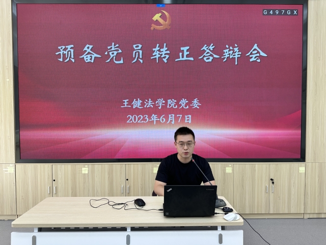 会议的第一项议程是预备党员转正答辩。答辩包含个人评议、现场问答和现场评议三个环节,答辩评议小组现场抽取了7位预备党员进行转正答辩。预备党员从思想、学习、生活等方面进行个人陈述;答辩评议小组从党的基础理论知识、时事政治、义务履行、理想信念等方面进行现场提问,答辩对象公开答辩;答辩小组现场评议,所有预备党员均一次性通过转正答辩。单杰做点评,他指出:预备党员转正答辩非常有意义和有必要,让大家重新受到了一次党员教育洗礼;今天参与答辩的党员不仅显示出了自身坚定的理想信念,更凸显了过硬的政治素质,特别是在政治理论学习、政治素养提升方面的努力与成效;希望同志们不论是在当下,还是未来走上不同的工作岗位,都要时刻牢记党员身份,始终牢记入党初心,时刻发挥党员的先锋模范作用,成长为德法兼修,可堪重任的时代新人。