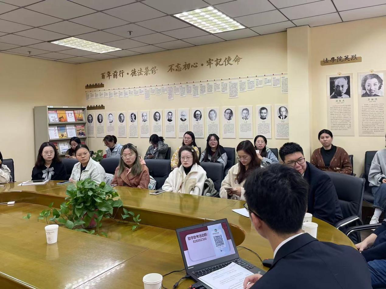 随后进入交流分享环节。先由2021级民商法学专业徐坚同学进行分享,他强调对于专业课的学习一定要提早准备,合理安排自己的时间。对于别人的进度不用太在意,按照自己的节奏和计划去学习,不要操之过急。紧接着2021级刑法学专业胡韬相同学也带来了他的考研经验分享,希望让大家稳住心态,牢牢把握冲刺的关键时期。最后由2021级法律硕士(法学)专业徐有加同学分享他的考研秘诀,他指出考研过程中最重要的就是心态和充足的休息时间,特别强调英语的学习要着重把握阅读理解,适度背诵相应的模板。三位同学都为大家毫无保留地分享自己的考研成功心得,他们的成功既有内心的坚持与努力,也离不开强大的心理素质。