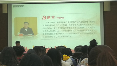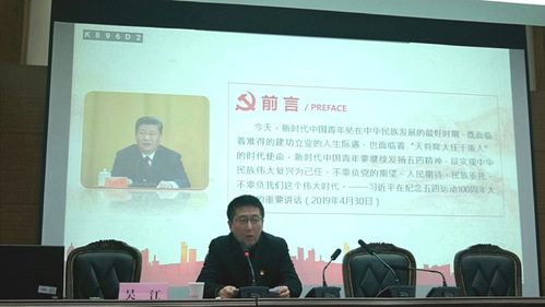 开班典礼结束后,吴江书记为全体学员上第一节党课,学习主题为“学‘习’理论,报效祖国”。课程开始,吴书记就指出青年始终是实现中华民族伟大复兴的先锋力量,他通过习近平总书记在纪念五四运动一百周年大会上发表的重要讲话,结合习近平总书记在全国两会期间参加有关团组审议讨论时的重要讲话精神,期望当代中国青年有深厚的家国情怀,有开阔的国际视野,有敢为人先的创业气魄,有脚踏实地的苦干精神,能深刻体会中国所取得的举世瞩目的伟大成就。