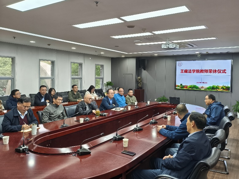 在温馨而庄重的荣休仪式上,方新军院长满含敬意地对各位荣休老师的辛勤付出致以诚挚感谢。他深情回顾了老师们在岗时的点滴,言语间难掩不舍,更期待老师们未来继续助力法学院前行。